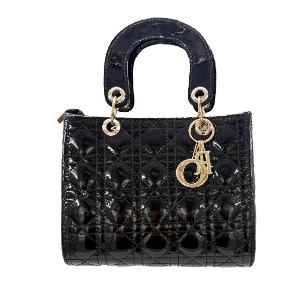کیف دستی ورنی مدل دیور، از چرم مصنوعی براق و دوخت بخیهای منظم ساخته شده و فرم چهارگوش آن ظاهر مرتب و کلاسیک ایجاد میکند. بدنه کیف استحکام کافی دارد و حالت خود را به خوبی حفظ میکند. یراق فلزی طلایی رنگ در بخش اتصال دسته ها و آویز تزئینی، تضاد چشمگیری با رنگ مشکی ایجاد کرده است.